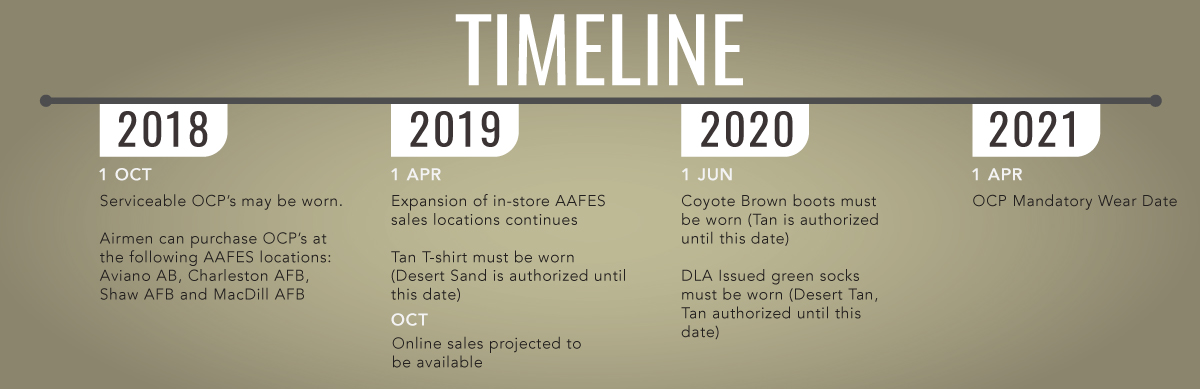 Starting Oct. 1, 2018, Airmen who have serviceable OCPs may wear the uniform, and Airmen can purchase OCPs at Army and Air Force Exchange Services at the following locations: Aviano Air Base, Charleston Air Force Base, Shaw Air Force Base, and MacDill Air Force Base. These initial locations will allow uniform manufacturers to produce additional stocks for other locations, eventually outfitting the total force in the coming months.